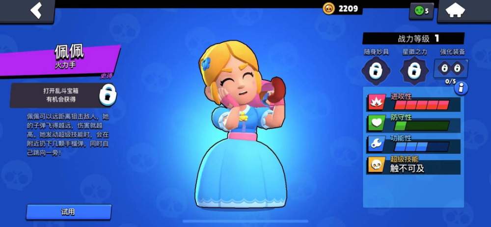 作为极其需要预判的英雄,佩佩的上限也是很高的。尤其是在解锁了妙具和星辉之后,佩佩的狙杀和防守能力更是得到了极大的提升。但是玩家在刚接触BS时,由于对战局的把控和对敌方火力的强弱分析不足,再加上预判能力有限,就很容易出现看似很努力然而打不到人的局面。佩佩作为一个狙击手,有着极强的远距离伤害和强大的逃跑位移大招,但是剩下的似乎都是缺点,较慢的移动速度和装弹速度,对于枪法和站位的要求极高。同时身板很脆,对于地图资源争夺能力也比较差,由此对玩家的自信也是一种打击,所以初期和14赛季小编都不推荐培养。