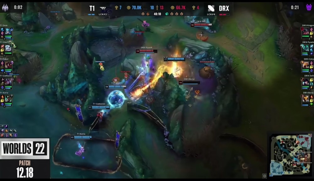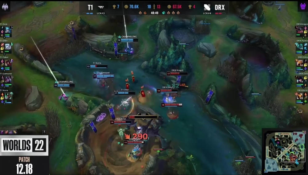 当时的情况是T1和DRX正面竞争远古龙,T1选手站在靠后的位置,当时的决策选择让佛耶戈去拼惩戒,然后Faker和Zeus直接TP偷家去了,结果两个人是被TP赶回去的剑魔给限制住了,之后DRX的几个队友也都回来了,T1的偷家就这么失败了。
