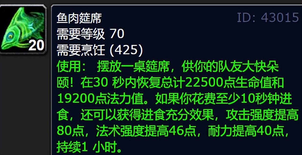 WLK版本烹饪BUFF种类繁多,从法伤急速到命中精准应有尽有,不过绝大多数玩家都不会携带任何烹饪消耗品,因为打本肯定会有人放鱼。事实上鱼肉筵席并非所有职业的BIS烹饪,比如邪DK等板甲DPS吃40力量烹饪收益高于80攻强,后期堆破甲的物理职业也要吃40破甲烹饪。
