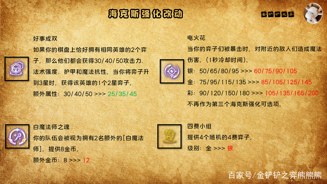 点评:好事成双的调整利好新手玩家,(大部分人玩不好干脆不选);白法魂的调整加上后面赛娜增强、枪手系削弱,法系环境变差;电火花增强过后依然无人问津,这次调整有望配合8格斗、8保镖等体系创造一些奇迹;四费小组变银就离谱,当钱拿都不亏。
