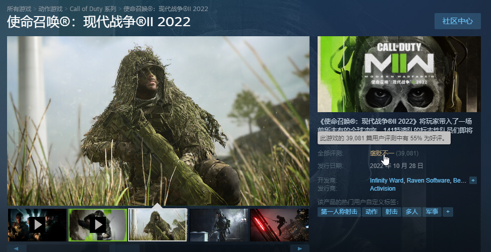 不过与优秀的商业表现形成对比,《使命召唤19》在玩家间的评价褒贬不一,以Steam平台为例,游戏的好评率已经跌到了55%。