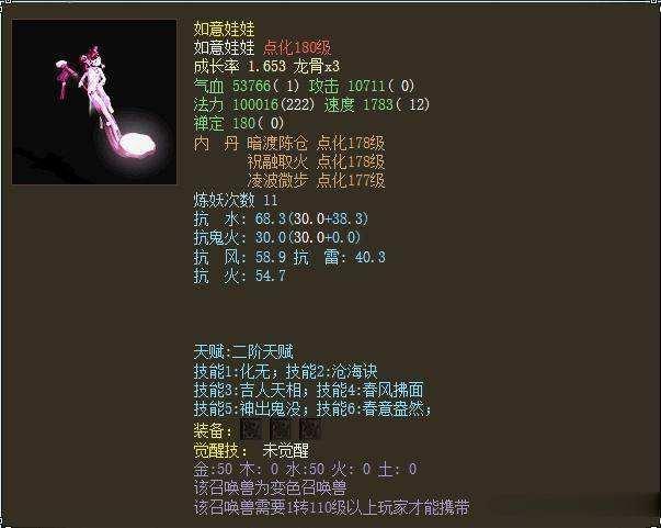 很多玩家似乎对如意娃娃这个召唤兽不太了解,其实也有一些玩家喜欢,主要是造型可爱,法量也不错,而且他的秒转乾坤技能能让自己收到的伤害转成法量伤害,有了这个技能,可以承受很多的伤害。