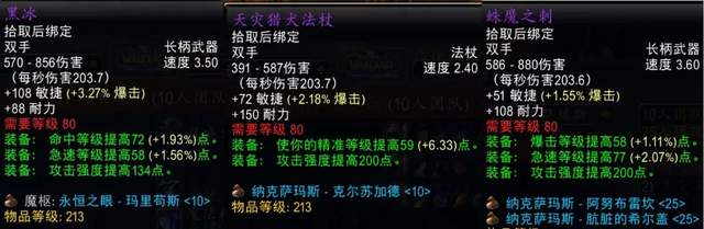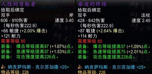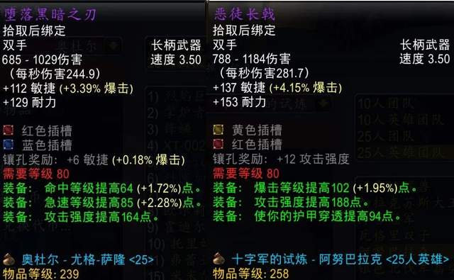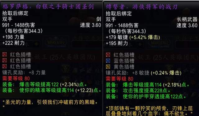 除了T7团本外,25人模式T8、T9和T10团本的最终BOSS都会掉落顶级长柄武器,堕落黑暗之刃和恶徒长戟属性优秀,看得小土人直流口水。不过比起同阶段的力量破甲双手武器还是因为没有力量而略逊一筹,只算是狂暴战的准BIS武器。