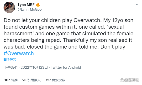 10月23日,一位网名叫做Lynn MBE的Instagram博主在推特上反馈,他的12岁儿子在《守望先锋2》中碰到了成人内容。“不要让你的孩子玩《守望先锋》。我12岁的儿子在里面找自定义游戏,其中一个叫‘性骚扰模拟器’,另一个则是模拟被强奸的女性角色。”