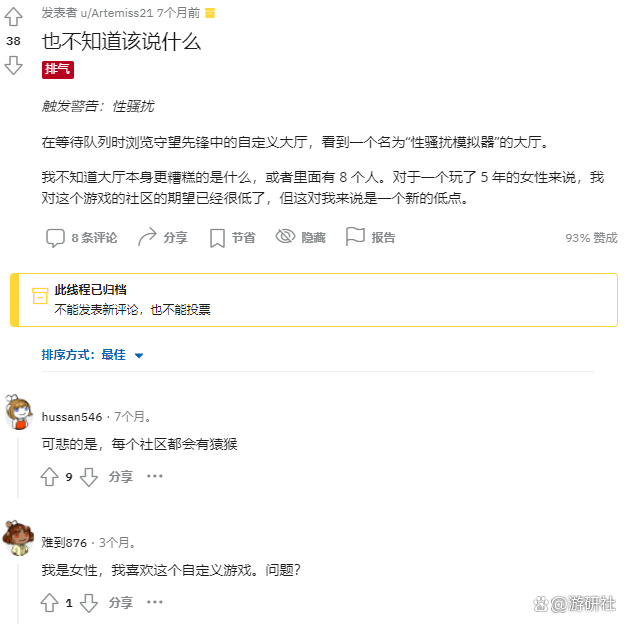 在Lynn与Limmy之前,也有少数玩家发现“性骚扰模拟器”或类似的色情内容后,在推特、Reddit,或者暴雪官方论坛公开表达不满。