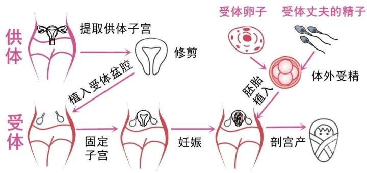 从供体获取配型良好的子宫,体外修整以后将子宫植入受体的盆腔。