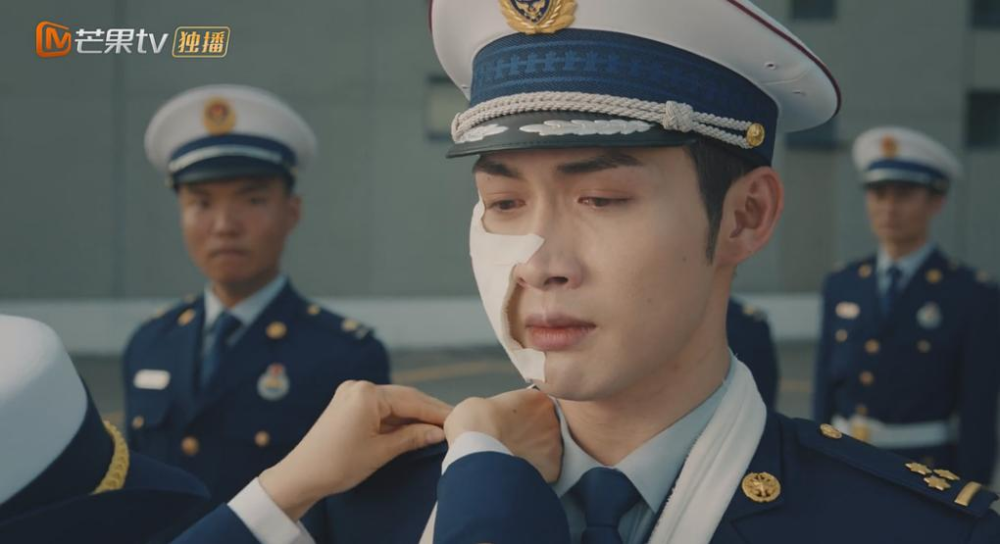 还有最后那一段被“封神”的“退队”桥段,他脸上打着大大的纱布,敬礼时眼含泪水,情绪要泄不泄,让人真的很有共鸣。
