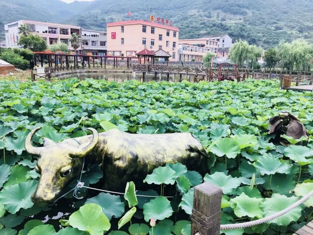 池塘里水车悠悠,逼真的牧童老牛雕塑徜徉塘中,绘成一幅素雅出尘的夏日田园画卷。