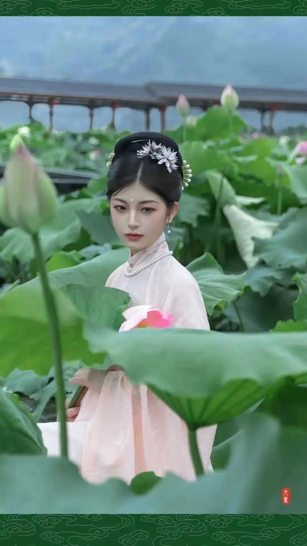着一身汉服,扶一株荷花,人在花间走,宛如画中游,尽显悠然。