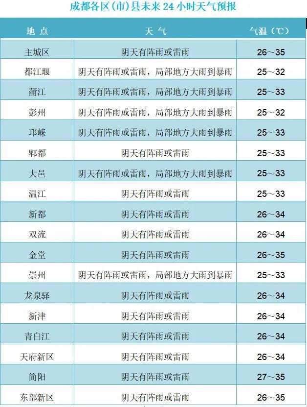 截至目前,大邑、邛崃、崇州、双流、蒲江、新都、四川天府新区、龙泉驿、金堂和简阳的高温预警信号仍在生效中,其余各区(市)县将根据气温发展情况,适时发布。