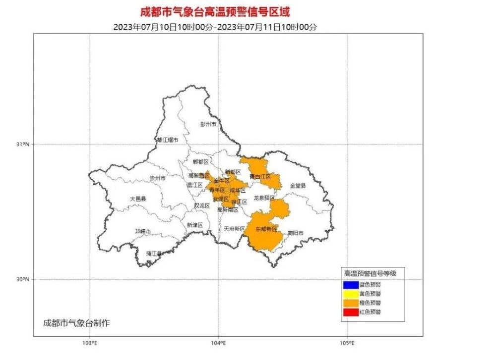 成都市气象台2023年07月10日10时00分发布高温橙色预警信号: