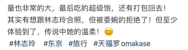 粉丝想要与林志玲合影留念,可遭到对方婉拒,不过她表示体验到了“志玲姐姐”传说中的温柔,这让其非常满足。