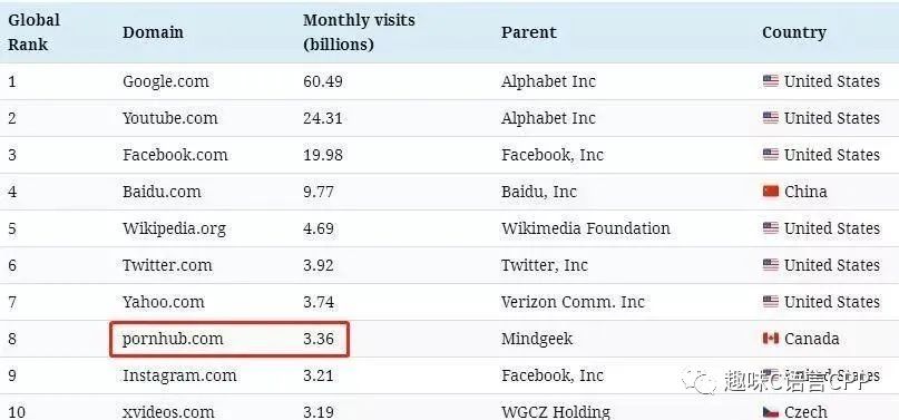 来源:乌鸦校尉(ID:CaptainWuya)编辑:可可2019 年,Pornhub 访问量达到了 420 亿次,平均每天有 1.15 亿次老司机开车,数据再创新高。虽然全世界访问量最大的视频平台是 Youtube,但是 Pornhub 是当仁不让的成人视频网站第一,视频网站第二。▲2019 年,P 站在全球网站点击量排名第八,在视频网站中排名第二