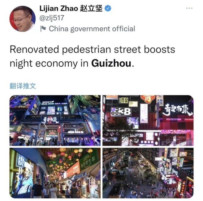“升级改造后的步行街助推贵州夜经济。”7月25日,外交部发言人赵立坚在推特发文关注贵州贵阳青云市集夜经济发展情况,并配图展示贵阳文创街区的特色美景。