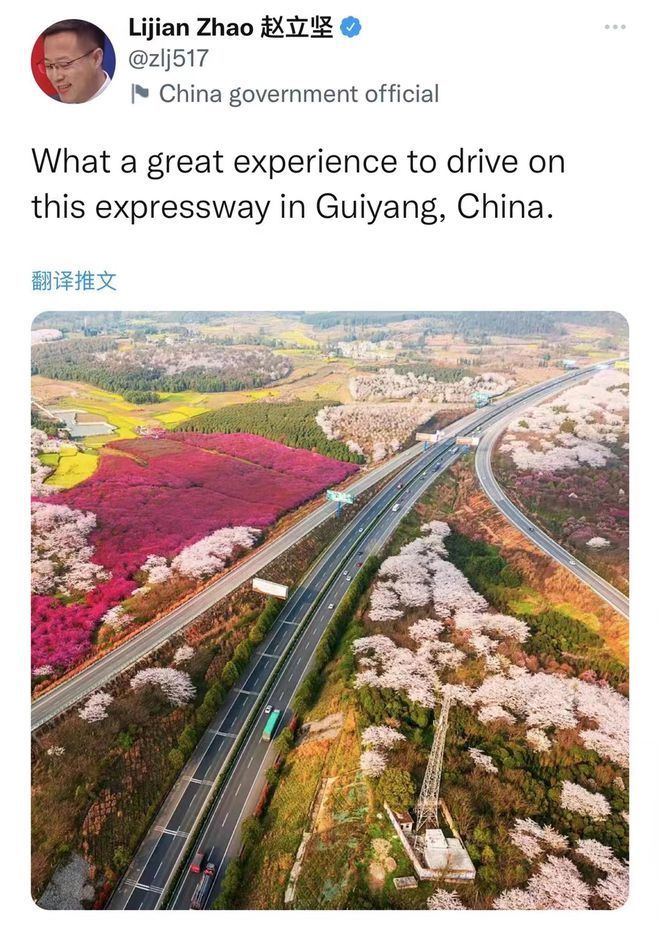 4月22日,赵立坚在推特平台上发布了一张美图,并配文“What a great experience to drive on this expressway in Guiyang,China.(在中国贵阳的这条高速公路上开车,是一种多么棒的体验。)”,向全世界宣传推介贵州,点赞这条“樱花公路”。