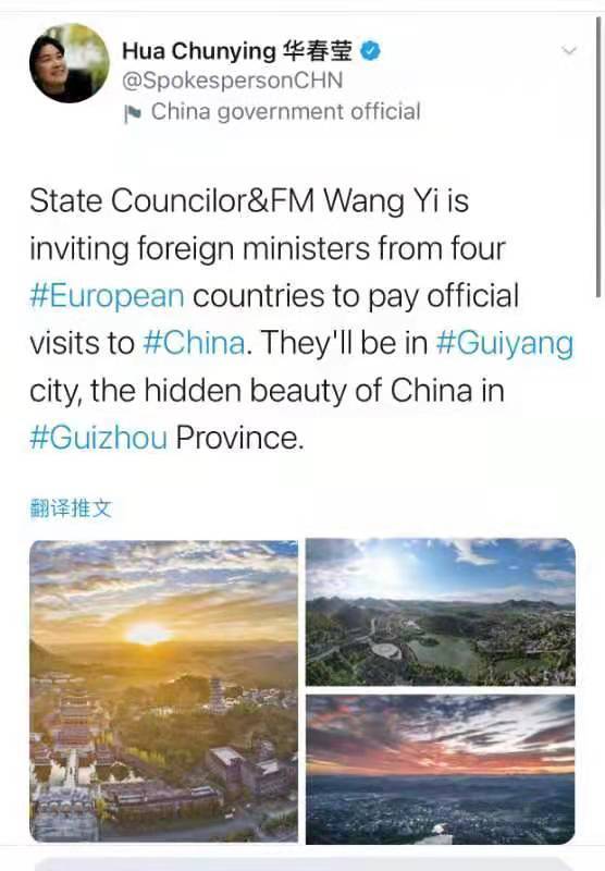 5月,外交部发言人华春莹在她的推特账号上发布消息,称赞贵阳是“隐藏在中国的美丽城市”。