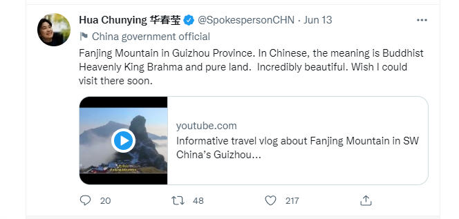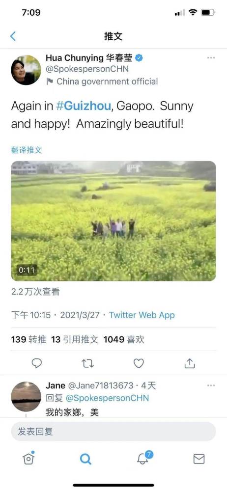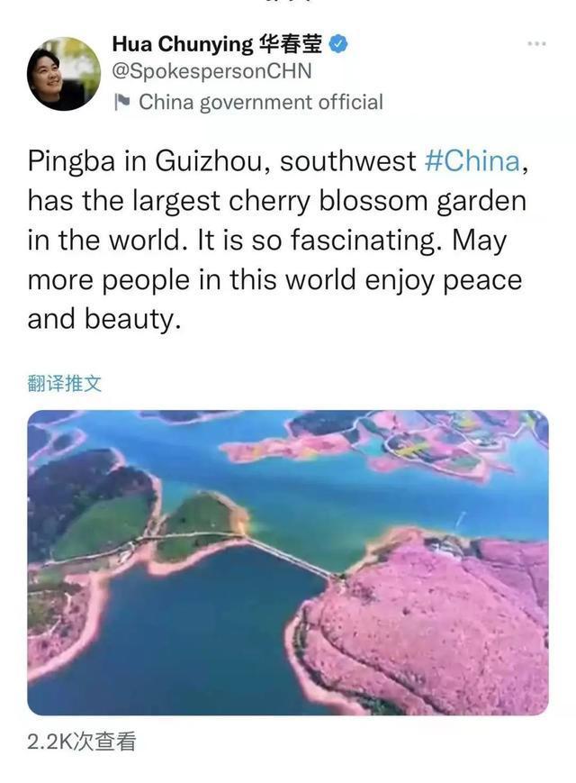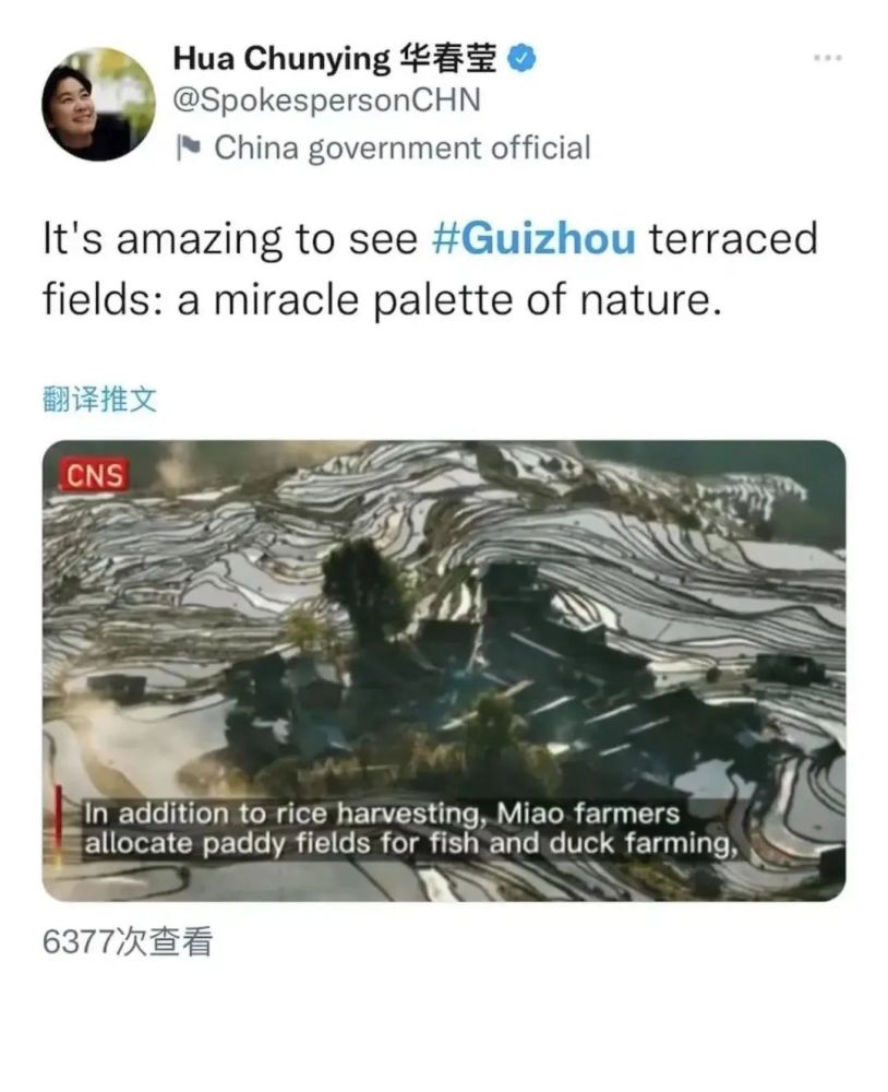 当天,华春莹连续发送了4条推文,其中一条还点赞了贵阳花溪高坡美景。推文称,“还是贵州,高坡。阳光明媚而且很开心!太美了!”