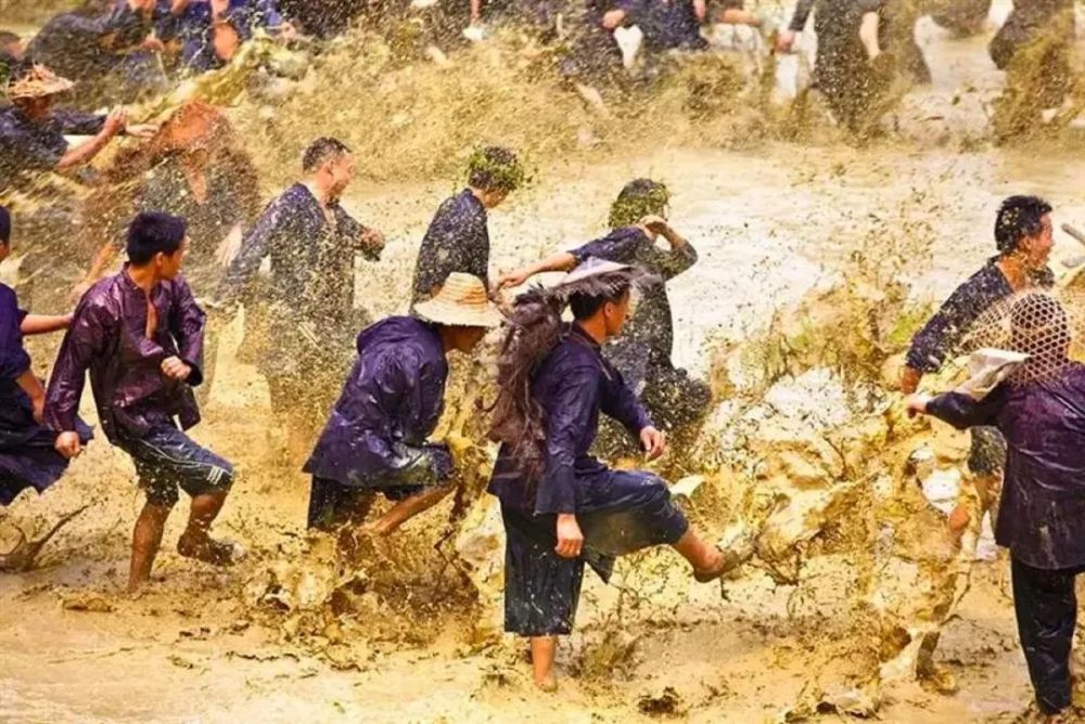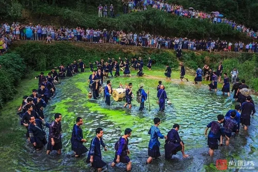 每年农历六月第一个卯日后的第一个丑日,村里都会举行“起鼓”仪式,村中男人身着女人衣裙、头戴斗笠、倒披蓑衣,赤足在水中,由祭师领舞,众人辅以夸张的肢体动作,随鼓而舞,水花四溅,少女们则身着盛装在岸边高唱飞歌助兴。