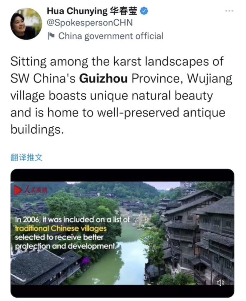 “乌江寨坐落于中国西南部贵州省的喀斯特地貌中,拥有独特的自然风光和保存完好的古建筑。”7月23日,外交部发言人华春莹在推特发文并配以视频展现“赛江南”的贵州独特之美。