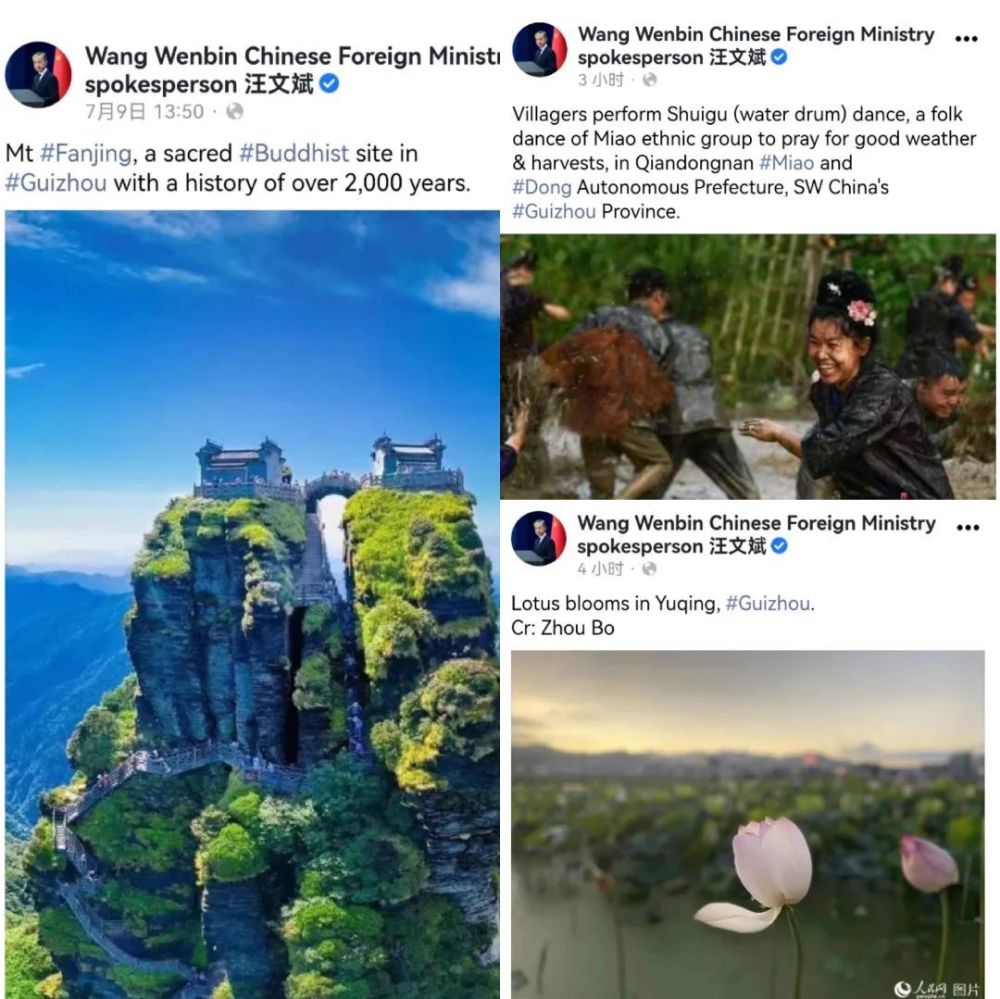 7月9日,外交部发言人汪文斌在他的脸书账号上发布多条推文点赞黔地美景,“一键三连”为贵州打call。