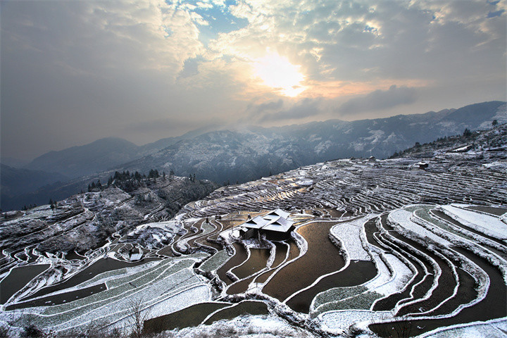 加榜梯田是当地苗族同胞的杰作,梯田依山而开,层层叠叠,随山势地形变化呈现出不同的秀丽线条,犹如雕琢在深山里的诗行。