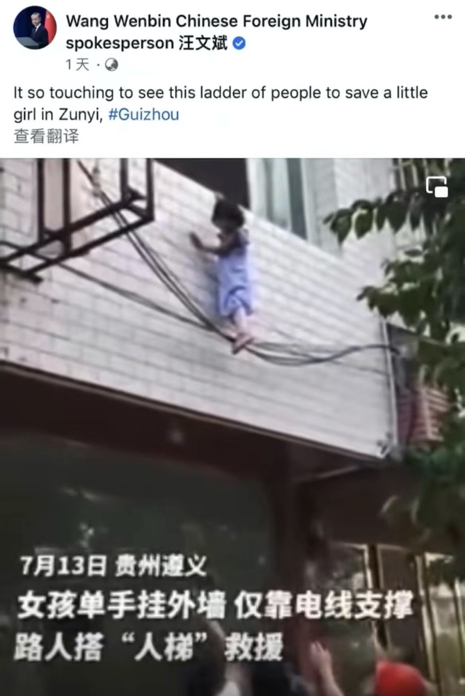 “贵州遵义感人一幕:路人搭成人梯,救援被困的女孩。”7月19日,外交部发言人汪文斌在“脸书”发文并配以视频点赞“最美人梯”。