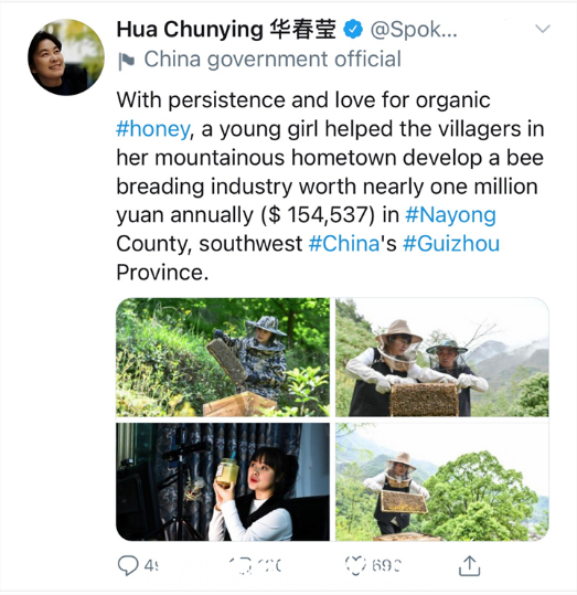 一位是贵州省毕节市纳雍县的养蜂女孩袁小梅,推特中说:“由于对有机蜂蜜长久地坚持和热爱,中国西南部贵州省纳雍县的一个年轻女孩创造了年产值近百万元(约合154537美元)的养蜂业来推动她的山区家乡的发展。”