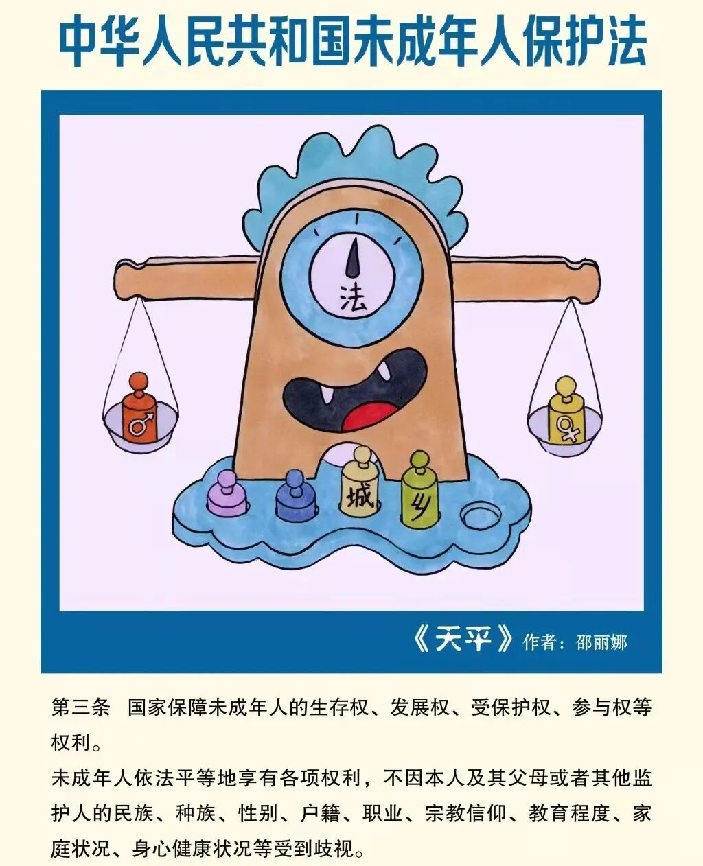 第一章总则 第三条:未成年人依法平等地享有各项权利,不因本人及其父母或者其他监护人的民族、种族、性别、户籍、职业、宗教信仰、教育程度、家庭状况、身心健康状况等受到歧视。