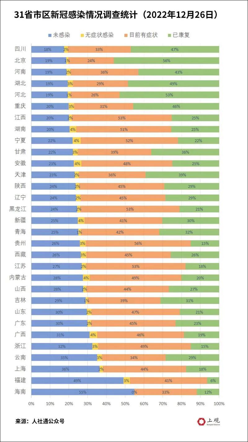 各省市新冠感染比例的调查统计人社通于2022年12月26日发布了各省市新冠感染比例的调查统计,当日共收到15107份问卷,共计47897人参与投票。