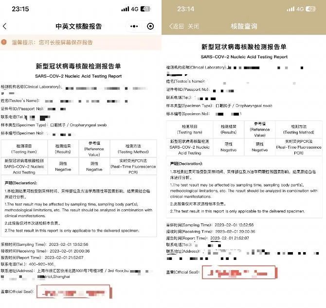 公众在本市任意核酸检测点完成核酸采样检测后,可通过“随申办”移动端“核酸查询”服务或者“随申码”页面“核酸&疫苗”服务的“中英文核酸检测报告”模块免费下载7日内最近一次的中英文核酸检测报告。该模块将全市核酸检测系统的信息进行汇聚整合,已覆盖本市220多家检测机构数据,在提取相关必要核心信息的基础上,集中生成简化版的中英文核酸检测报告,以尽可能满足公众拟前往国家(地区)的要求。