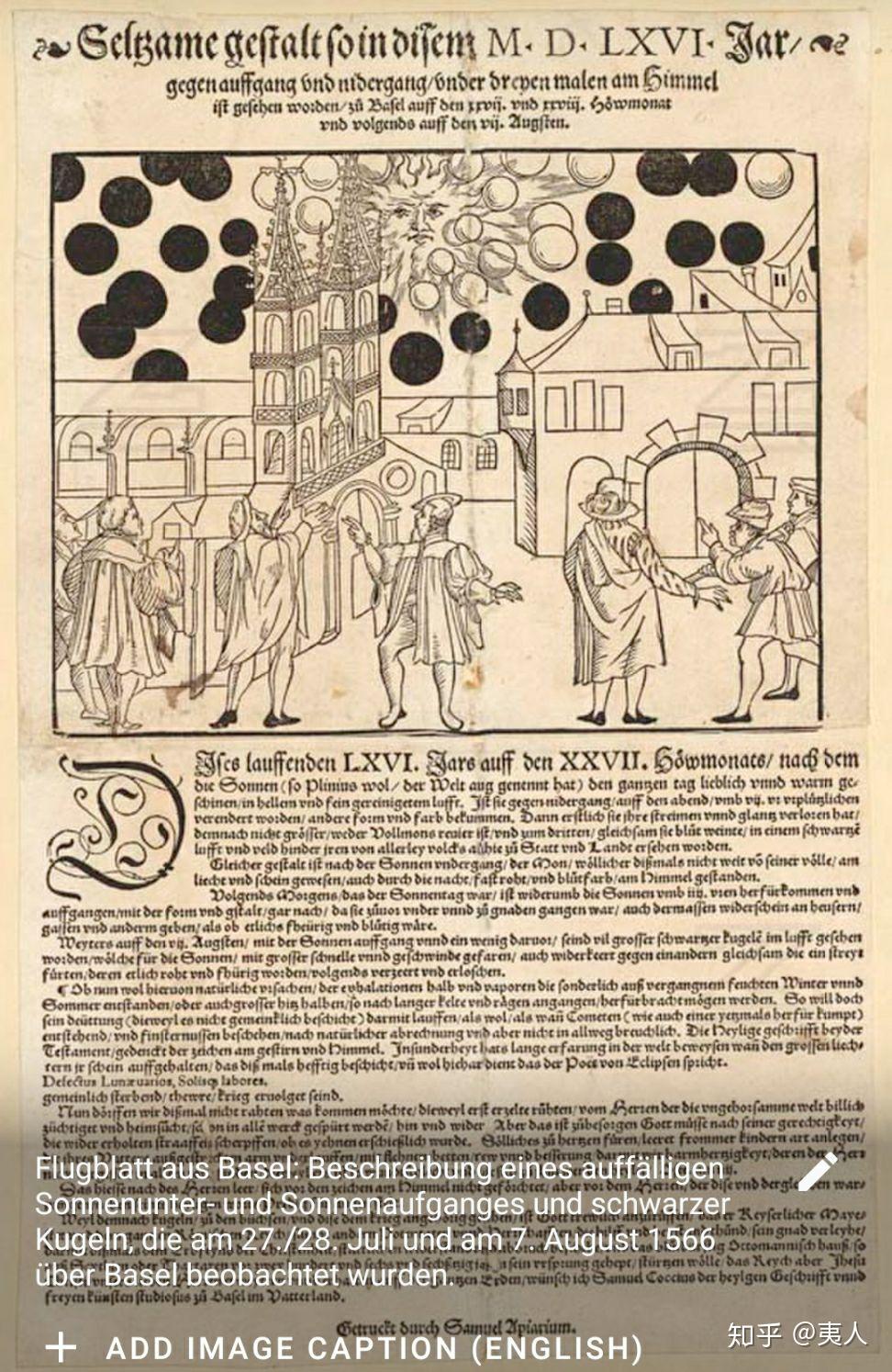 “天体现象发生于1566年的巴塞尔上空,由三个独立事件组成,分别是7月27日和28日,以及8月7日,与正常的日出或日落不同,我们在巴塞尔上方的天空中看到了奇怪的形状。