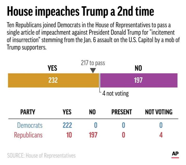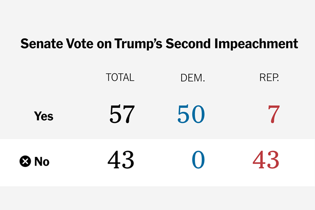 美国时间2月13日周六下午,参议院在经过了短暂四天的审判之后,以57票赞成,43票反对的比例,驳回了针对已经是前总统的特朗普的弹劾指控。由于美国宪法给弹劾定罪设立的最低标准是参议院总票数的三分之二(67票),尽管这次支持弹劾特朗普的票数已经过半,最终仍是以10票之差让特朗普再度“脱罪”。