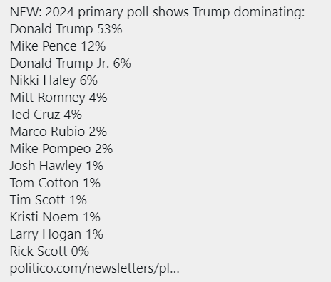 一个接一个的民调显示有60-70%的共和党人希望特朗普未来在共和党扮演重要的角色,Suffolk的民调指出如果特朗普脱党成立第三党的话,会有46%的共和人跟随他另立山头。具体问到2024年潜在的共和党初选较量这一问题上,超过半数的共和党选民仍把特朗普列为首选,其余人除彭斯拿到两位数支持外均在个位数徘徊。