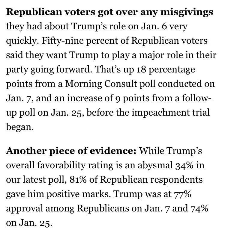 然而,弹劾程序本身所需的时间加上当时仍是多数党领袖的麦康纳尔拒绝提前召回参院开会的行为,随着特朗普的下台,经过时间沉淀后了解了党内基层民意的共和党人显然是不会再做出有违他们“理性 自保“一面的选择。