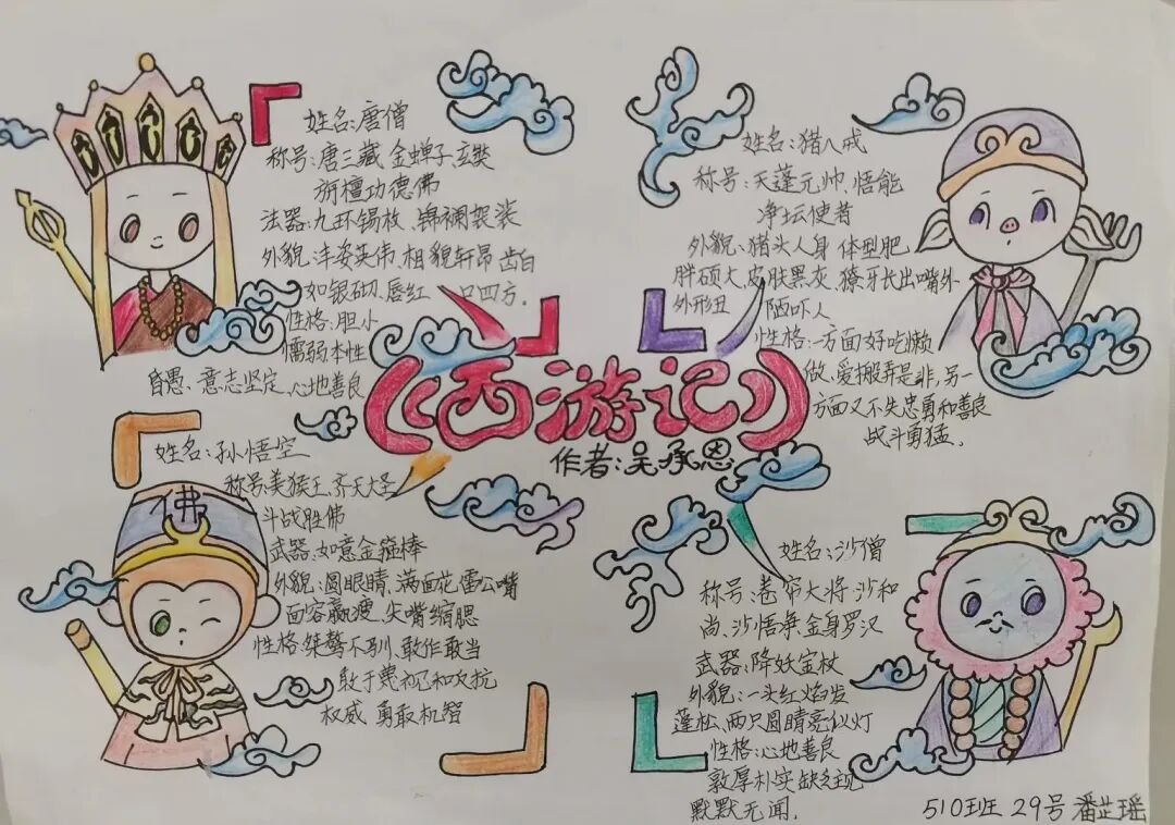 教师点评:《西游记》是明代小说家吴承恩的作品。故事以唐僧、孙悟空、猪八戒、沙和尚去西天取真经为主线。一路上他们遇到了各种妖魔鬼怪,他们历经艰辛,跋山涉水最后终于取得了真经。故事把坚忍不拔的唐僧,神通广大的孙悟空,忠诚又老实的沙僧等人都描绘得栩栩如生。
