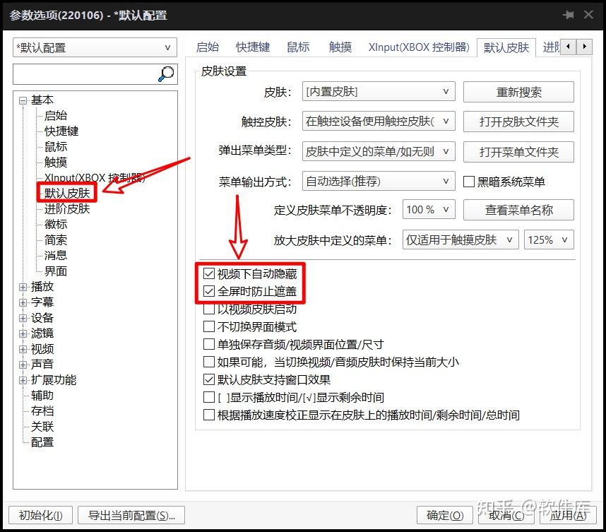 隐藏边框的具体设置方法就是「F5」-「基本」-「默认皮肤」,将「视频下自动隐藏」和「全屏时防止遮盖」勾选上,然后点击「应用」即可。