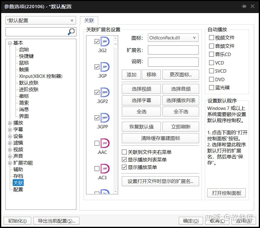不过需要我们手动设置一下格式关联,换句话说就是将默认的视频播放器改为 PotPlayer 。我们在软件界面按「F5」打开默认配置,点击「关联」-「选择视频」-「应用」。