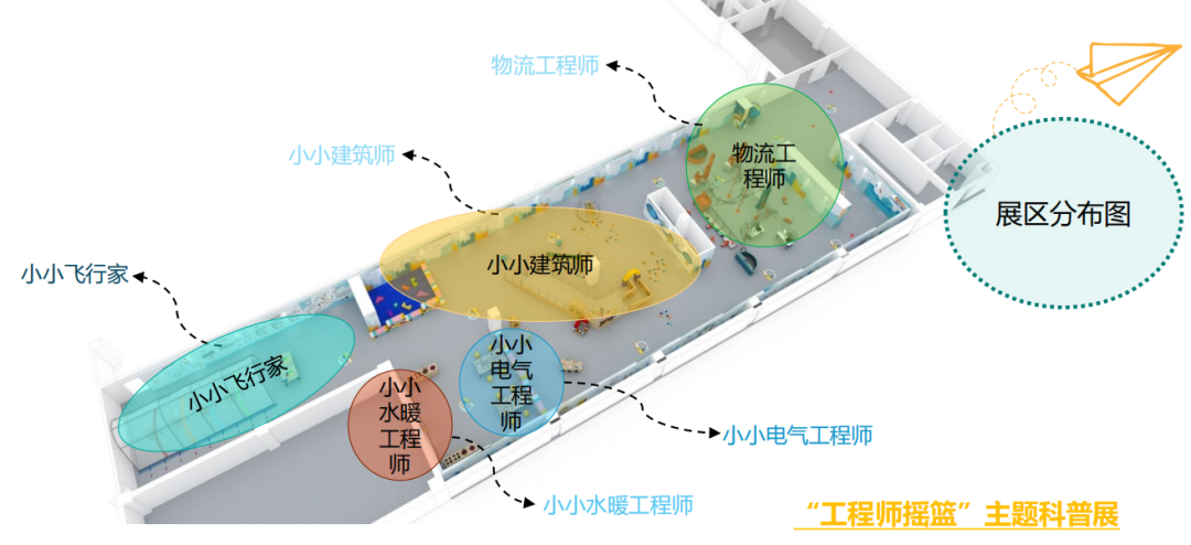 “工程师摇篮”主题展包括小小建筑师、小小电气工程师、小小水暖工程师、小小飞行家、物流工程师五大主题,展品展项包括塔吊、房屋搭建、补墙、砌墙、美化我们的家、推车运砖、EVA搭建和电工积木及电气科学小实验等。展览以“沉浸式”的形式,融入当下先进的STEAM教育理念,让孩子们化身“工程师”与小伙伴们一起放飞思绪,大开脑洞。