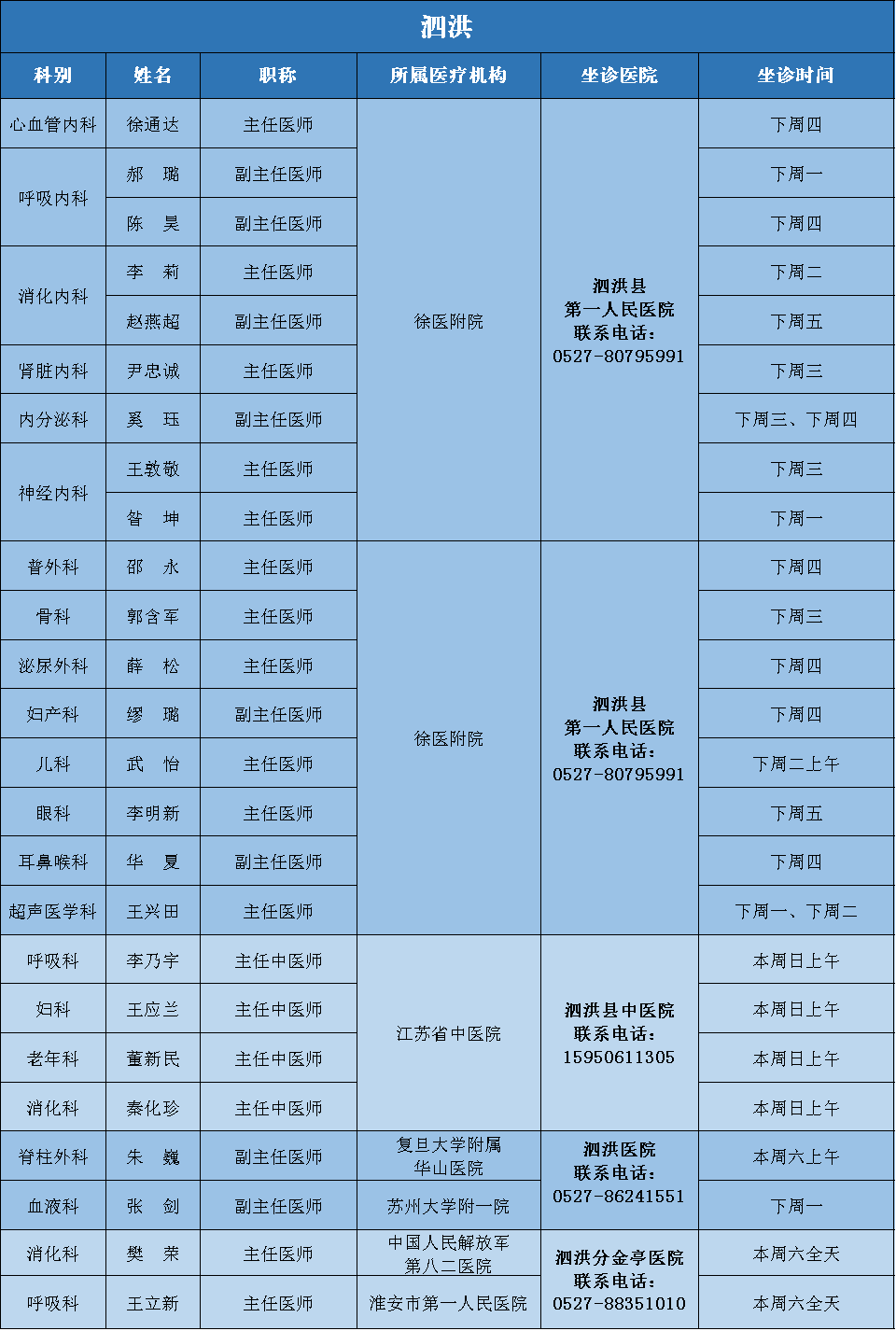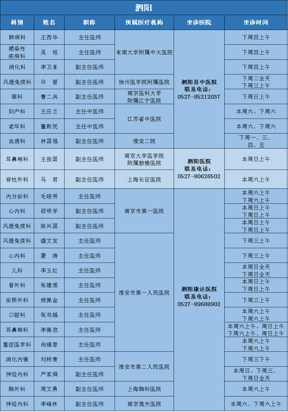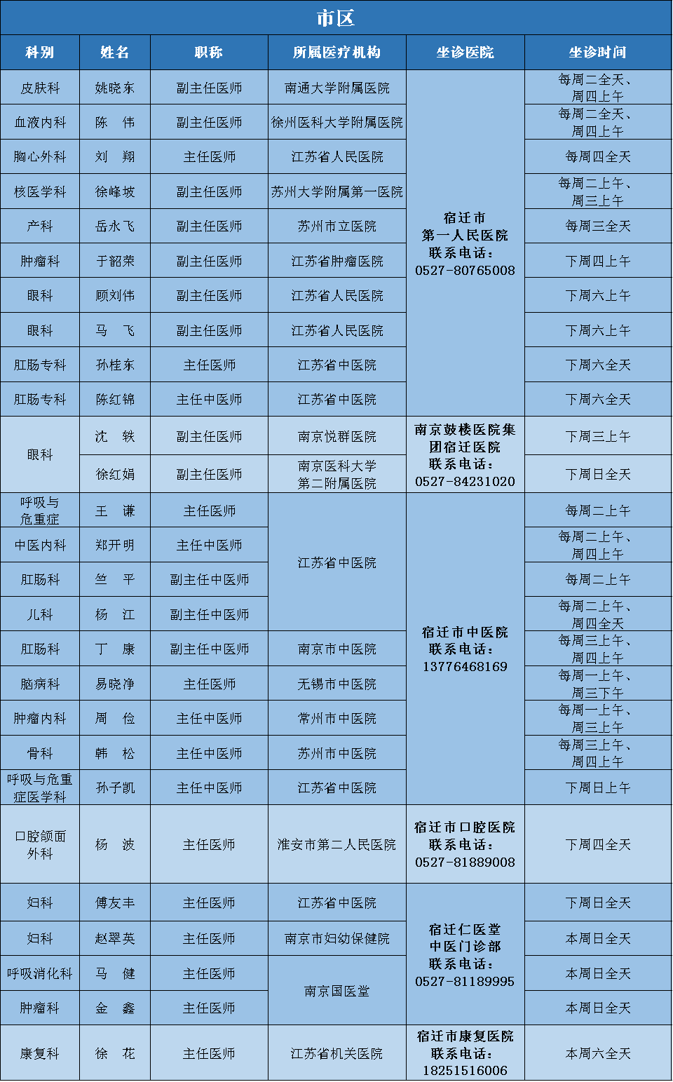 为满足广大人民群众多层次就医需求,提高患者就医感受,降低市外就医风险和成本,在家门口即可享受市外专家优质医疗服务,由市卫健委主办、市医师协会承办的“宿医讯”平台,每周发布市外专家来宿诊疗信息,竭诚为广大市民服务。(因受疫情影响,部分专家可能临时调整,就诊前请与医院联系。)