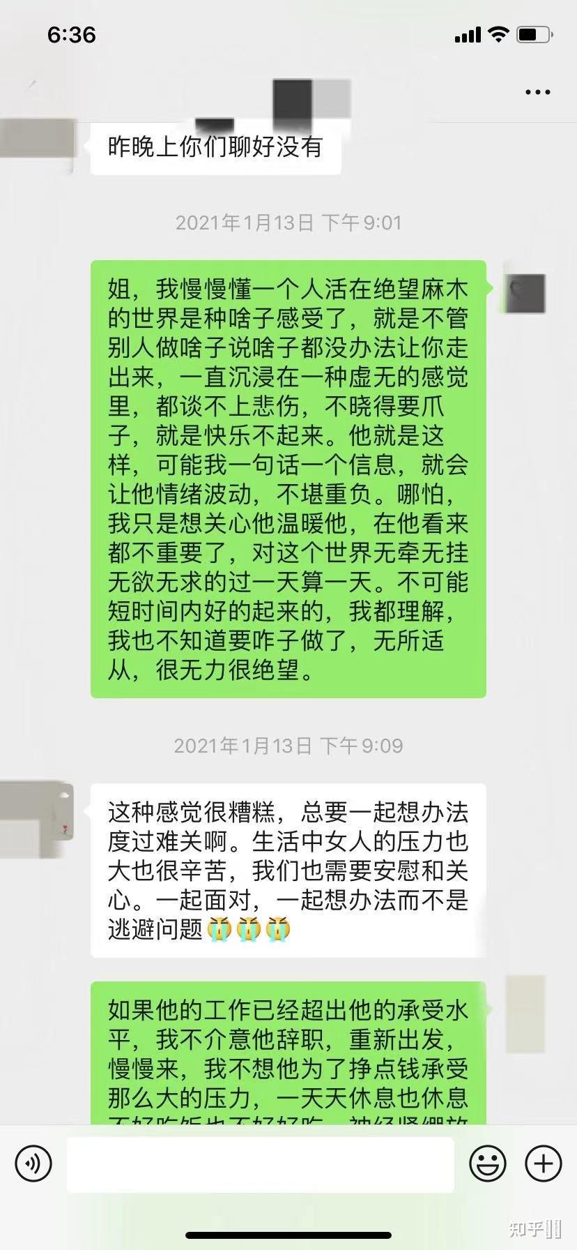 前几天,我爸妈在老家买了头年猪杀,邀请她妈妈到家里吃饭。趁着大家都在,我给他们开了个小会。我说:爸、妈,按道理我是晚辈,不该给你们提什么要求,但为了不让你们担心,我还是有事情拜托你们。是的,正如你们看到的,我跟他已经快大半年不怎么联系了,刚开始我还会埋怨、愤怒,但是自从上次元旦过后,我就想清楚了,或许我说他可能病了,你们会觉得矫情,不理解,但是请先相信我,我们暂时也不会离婚,请不要问太多干涉太多,尊重我们的决定。这段时间,除了关心他的话,我恳求你们不要再去责问他怪他逼他,只要他能轻松一点,开心一点,不回家不回信息不联系都没关系,我不需要谁为我打抱不平,我只希望他能健康平安。