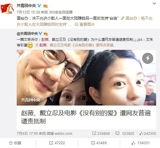 原来,当年赵薇在拍摄电影《没有别的爱》中,使用了被质疑为“台独”的戴立忍作为演员,并且还是这部电影的男主角。