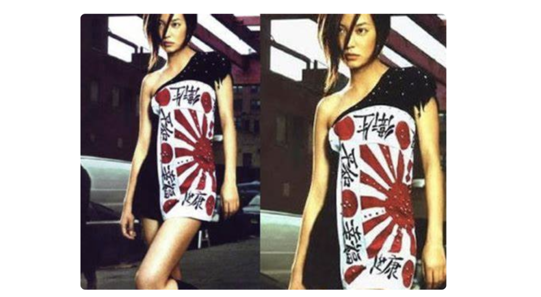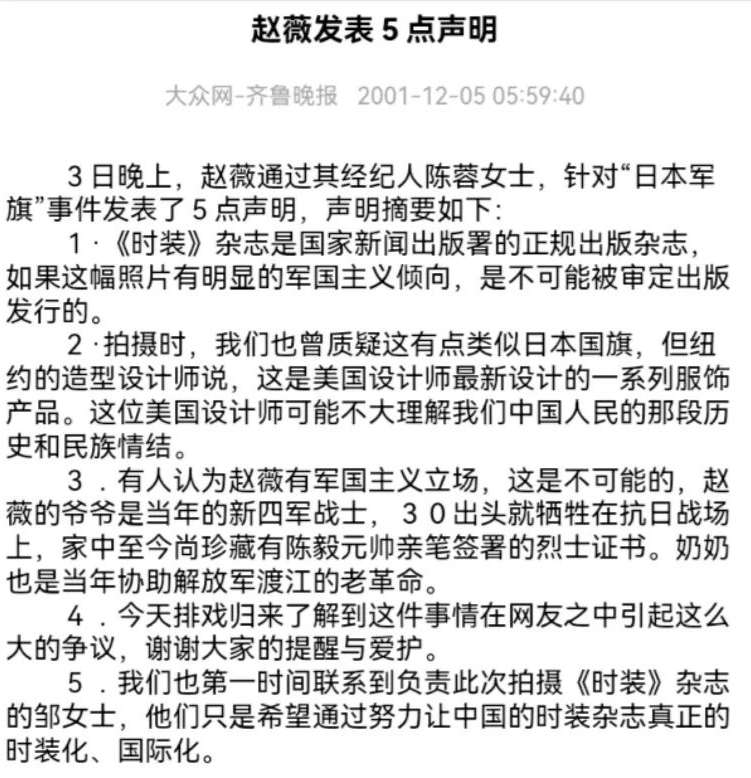 著名杂志《时装》当时给赵薇照片时,赵薇赫然披着一块“日本军旗”当作衣服。