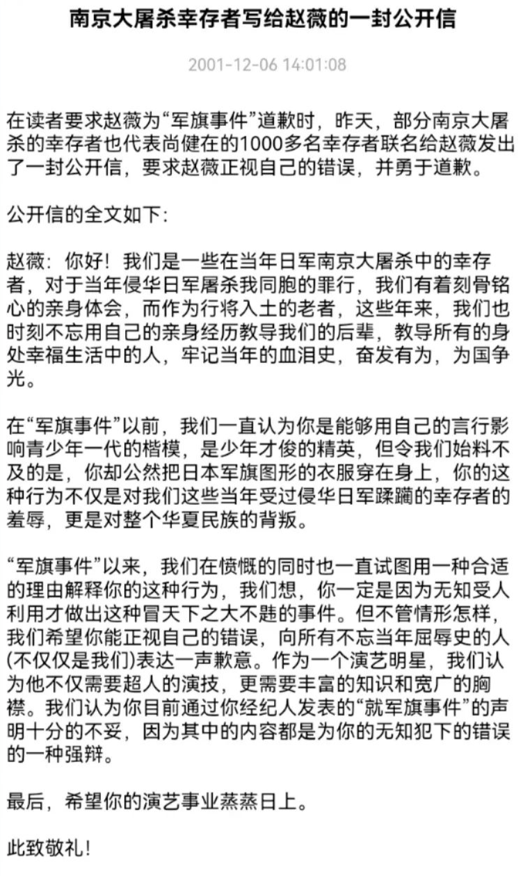 之后南京大屠杀幸存者联名给赵薇写了一封公开信,希望她能正视错误,真诚道歉。