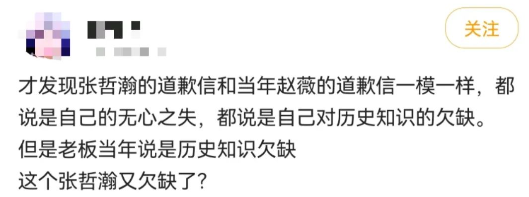 而且,据网友透露,张哲瀚找的借口、发表的道歉信,都几乎跟当年赵薇“军旗装事件”时“一模一样”。