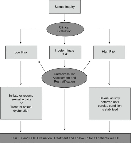 流行病学研究中心 - 抑郁量表是一种公共领域、用户友好的工具,用于评估抑郁症状 [ 200 ]。它易于解释,鼓励使用。有几种设计良好、经过验证的工具可以评估女性性功能 [ 129 ]。一种似乎越来越受欢迎的工具是女性性功能指数(FSFI)。FSFI 是一个简短的多维量表,用于评估女性的性功能。该量表已接受心理测量评估,包括对信度、收敛效度和区分效度的研究。作者发现 26.55 的 FSFI 总分是区分有无性功能障碍女性的最佳分数 [ 202 ]。FSFI 最近已被验证可用于癌症幸存者 [ 13 ]。虽然这一经过验证的女性性功能指数量表总分 26.55 的分界点使人们能够将女性分为有和没有性功能障碍的组,但没有特定于性欲 (SD) 领域的分界点来评估欲望减弱的存在在有或没有性欲问题的女性中。格斯特伯格等人。在 FSFI 的 SD 域上开发了诊断 HSDD 的最佳截止点:SD 评分为 5 或更低被认为具有 HSDD,而 SD 评分为 6 或更高则没有。在开发样本中,预测 HSDD(有或没有其他条件)的敏感性和特异性分别为 75% 和 84%,验证样本中相应的敏感性和特异性分别为 92% 和 89% [ 61 ]。用于评估女性性功能障碍的另一个工具是女性性困扰量表 (FSDS) 和女性性困扰量表修订版 (FSDS-R) [ 36 , 37 ]。FSDS 是一项包含 12 个问题的调查,涉及性困扰的不同方面。FSDS-R 是 FSDS 的附加问题,即患者对性欲低下的困扰程度 [ 37 ]。在原始验证研究中确定 HSDD 与无性功能障碍时,FSDS 的敏感性为 86%,特异性为 93%,PPV 为 0.9,在 ≥15 点的最佳截止点 [ 36]。在 FSDS-R 的验证研究中,最佳截止值≥11。在第 0 天调查结果中,HSDD 患者与无 FSD 患者的临界值产生 92.7% 的敏感性、96% 的特异性和 PPV 0.93 [ 37 ]。两个量表的重测信度和内部一致性也得到了测试和证明。HSDD 与其他 FSD 的调查得分相似,调查无法准确区分它们。重要的是要认识到,许多临床医生发现这些问卷在办公室访问期间使用起来有些麻烦。临床医生没有使用完整的仪器,而是采用了他们的做法,以便他们使用特定仪器的修改版本。这似乎很适合他们。已经开发了许多其他出色的工具来评估男性和女性的性功能。这些优秀工具的作者值得认可,由于我们无法将它们包括在本节中,我们深表歉意。最后,有许多工具可以评估老年男性和女性的情绪、抑郁、认知、力量、生活质量等领域。对这些文书的讨论超出了本章的范围。男性和女性性功能障碍患者的心血管评估:共识指南为临床医生提供了哪些心血管危险因素患者可以安全地重新参与性活动的算法。普林斯顿 II 和 III 共识指南文件讨论了针对具有各种 CV 风险因素的男性的方法以及他们重新参与性活动的能力 [ 98 , 143 ](图12.1)。低风险患者是那些心血管危险因素少于 3 个、控制了高血压等的患者。我们建议读者回顾 [ 98 , 143] 以更好地理解风险评估算法。重要的是,普林斯顿三世会议的数据已经浮出水面,审查了 CV 风险和女性性健康 [ 131 ]。其他最近的指南已提供帮助临床医生为有各种 CV 问题并希望重新参与性活动的患者提供咨询 [ 111 ]。