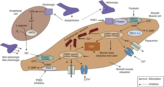 阴茎海绵体平滑肌松弛的调节及PDE5抑制剂的作用。ATP三磷酸腺苷、cAMP环磷酸腺苷、cGMP环磷酸鸟苷、eNOS内皮一氧化氮合酶、GTP鸟苷-50-三磷酸、IP3三磷酸肌醇、一氧化氮、PDE磷酸二酯酶、PGE1前列腺素 E1(经 Hatzimouratidis 等人许可转载。 [ 71 ])