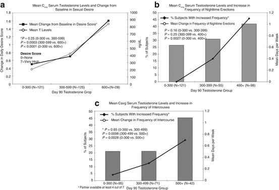 每日性欲评分和平均 C平均(0-24 小时)血清睾酮水平(ng/dL)与基线的平均变化;夜间勃起和性交频率增加和平均频率变化的受试者百分比(经 Seftel 等人许可改编。[ 167 ])(a)每日性欲评分,(b)夜间勃起频率,以及(c ) 睾酮治疗后平均 Cavg (0–24 h) 血清睾酮水平 (ng/dL) 为 0-300、300-499 和 500+ 的患者的性交频率