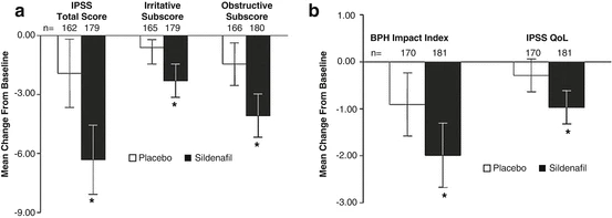 LUTS 评分从基线到治疗结束的变化。患者在基线和随机治疗 12 周后完成了 I-PSS 刺激性和阻塞性分量表 ( a ) 以及 BPHII 和 I-PSS QOL 问题 ( b )。I-PSS 最高分 35 分,刺激性最高分 15 分,阻塞性最高分 20 分。BPHII 最高分数为 13 分。I-PSS QOL 问题问“如果你的余生都像现在这样在泌尿系统中度过,你会怎么想?” 并以 0-6 分制进行评分。较低的 I-PSS 和 BPHII 分数表示较少的 LUTS、较少的麻烦和较好的 QOL。每组问题的 LS 平均分数下降幅度更大表明治疗结果更好。数据显示为 95% CI 的 LS 平均变化。星号表示 LS 平均分数的西地那非变化与安慰剂分数的变化 p < 0.0001(经 McVary 等人许可转载。[ 127 ])
