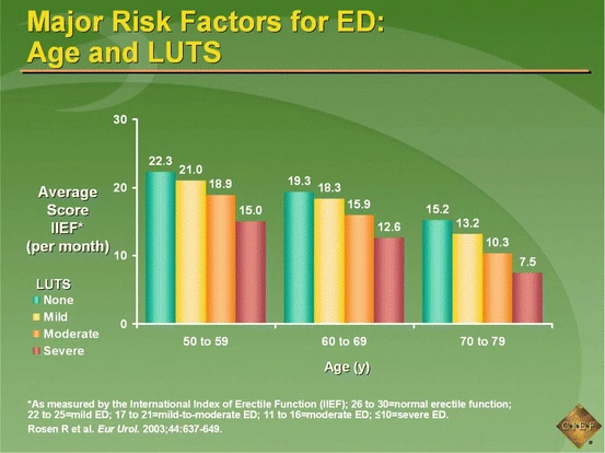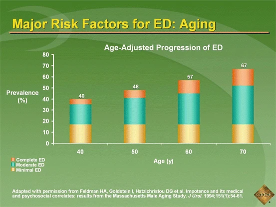 具有里程碑意义的马萨诸塞州男性老龄化研究 (MMAS) 是一项针对近 3000 名年龄在 40-70 岁的男性的社区观察性研究,明确确定 ED 是高度普遍的、与年龄相关的和进行性的。受试者 (n = 1290) 被要求回答一份描述其 ED 水平的性活动问卷。最小ED 被定义为“通常能够勃起或保持勃起”;适度,如“有时能够”;和完整的,因为“永远无法勃起并保持勃起”。自评 ED 反映在性交期间勃起困难的频率较高、每月性活动和勃起率较低以及对性生活和伴侣的满意度较低(经 Feldman 等人许可改编。[ 54 ])