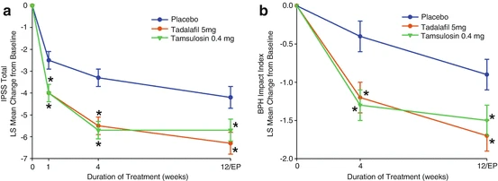 根据最近的一项荟萃分析,α-受体阻滞剂的平均 IPSS 改善(不是 SMD 与安慰剂相比)在 3-9 个月后为 -4 至 -6 点 [ 6 ]。在 Avodart 和坦索罗辛联合研究中,度他雄胺在 15 个月后的平均 IPSS 改善为 -4.8 分 [ 158 ]。与他达拉非相关的 IPSS 与这些值相当(见表12.9)。最常见的副作用是头痛、消化不良、背痛和鼻咽炎 [ 25 ]。在来自三项主要研究 [ 25 ] 的汇总数据集中,>90% 的副作用报告为轻度或中度严重程度。这些研究的停药率为 4 %,而安慰剂治疗组为 1.6 %。基于这些数据,他法拉非可安全用于患有 BPH/LUTS 和 ED 的患者。比较 PDE5-I 和其他 BPH/LUTS 药物的证据很少。奥尔克等人。[ 147 ] 将患者随机分配至安慰剂 (n = 172)、他达拉非 5 毫克/天 (n = 171) 或坦洛新 0.4 毫克/天 (n = 168),持续 12 周。使用他达拉非(-2.1;p = 0.001)和坦索罗辛(-1.5;p = 0.023)治疗 12 周后,IPSS 与安慰剂相比显着改善。他达拉非和坦索罗辛早在 1 周就出现改善(-1.5,p < 0.01)。与安慰剂相比,BPH 影响指数在首次评估时(第 4 周)使用他达拉非(-0.8;p < 0.001)和坦洛新(-0.9;p < 0.001)和 12 周(他达拉非 -0.8;p = 0.003;坦洛新 -0.6)显着改善; p = 0.026) (图12.7)。与安慰剂相比,使用他达拉非(均 p < 0.05)但使用坦洛新(p > 0.1)时,IPSS 生活质量指数和治疗满意度量表-BPH 有所改善。与安慰剂相比,他达拉非(4.0;p < 0.001)但坦索罗辛(-0.4;p = 0.699)没有改善 IIEF-EF。与安慰剂相比,他达拉非(2.4 ml/s;p = 0.009)和坦洛新(2.2 ml/s;p = 0.014)的Q max显着增加。不良事件概况与之前的报告一致。这项研究的局限性在于无法直接比较他达拉非与坦索罗辛。数据表明,与安慰剂相比,他达拉非或坦索罗辛单药治疗在 LUTS/BPH 症状和 Q max方面具有显着且数值相似的改善. 然而,只有他达拉非能改善勃起功能障碍。因此,每日他达拉非是治疗 ED 和 BPH/LUTS 的可行选择。